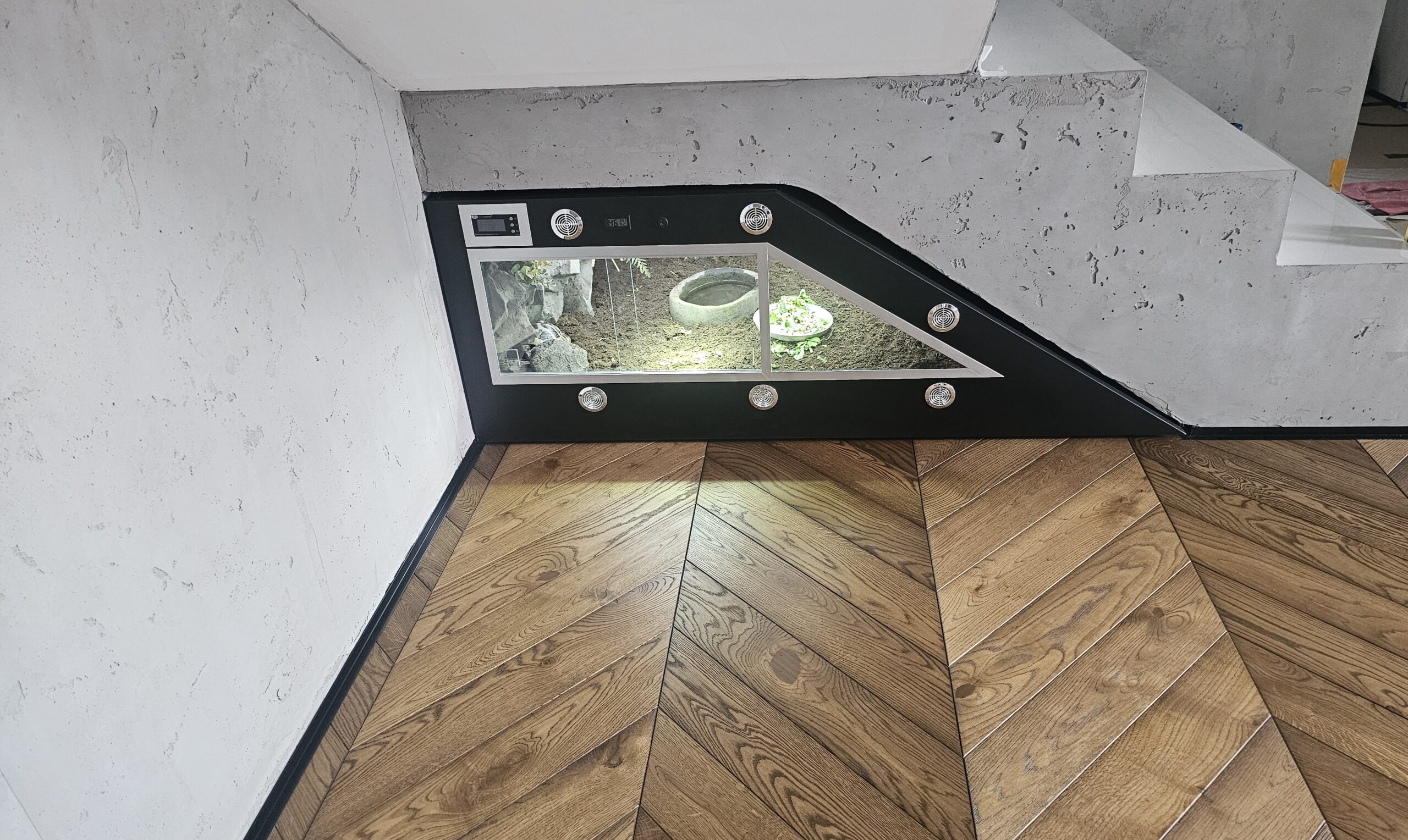 Terrarium na zamówienie dla żółwia lądowego zostało zaprojektowane z myślą o wstawieniu go pod schodami.